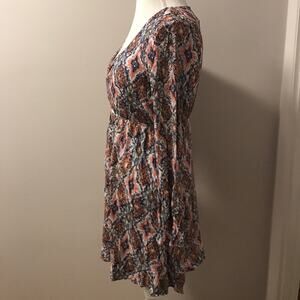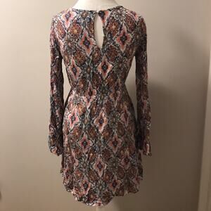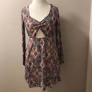 Boho style printed bell sleeve cutout dress. 95% polyester, 5% spandex. Elastic stretchy waistband.
