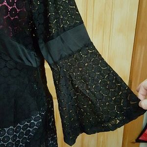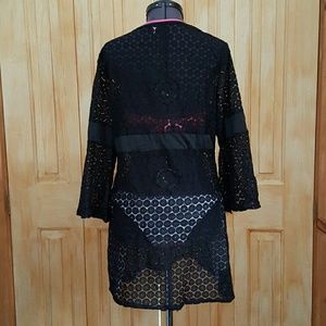 Beautiful black lace, v-neck swimsuit cover up with bell sleeves. This is versatile enough that you cou also pair it with legging and a cute cami underneath. Makes it totally worth the $ to be able to wear it 3 seasons instead of just the summer. Mermaid bikini shown underneath also listed. Dress form is set at 34-25-36. The tag says medium, but could easily fit a size larger or smaller.