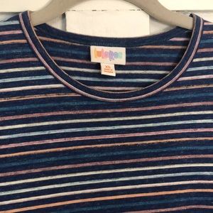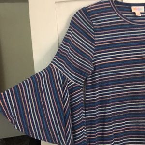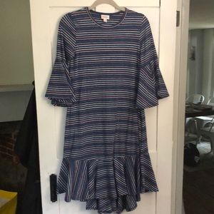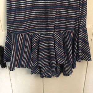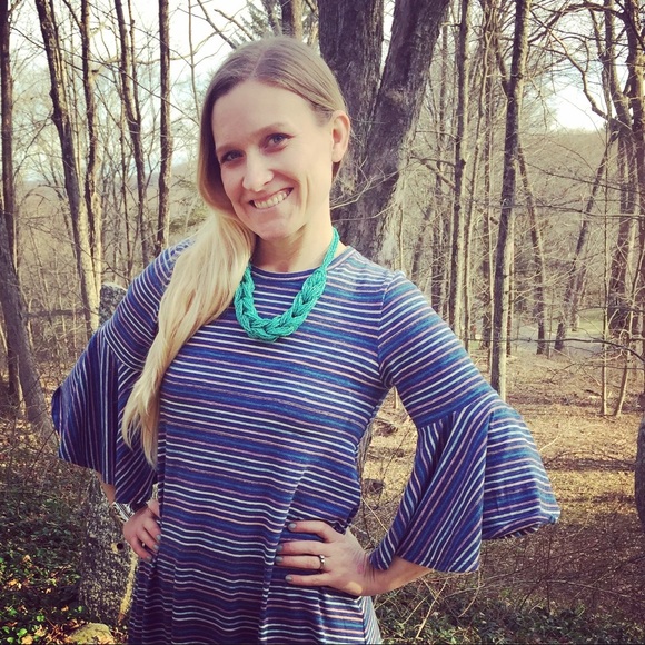Fun & flirty bell sleeved Ruffle dress! Gorgeous heathered strips of pink, blue, mustard yellow and teal over a denim blue background! A high low ruffle completes this style!