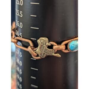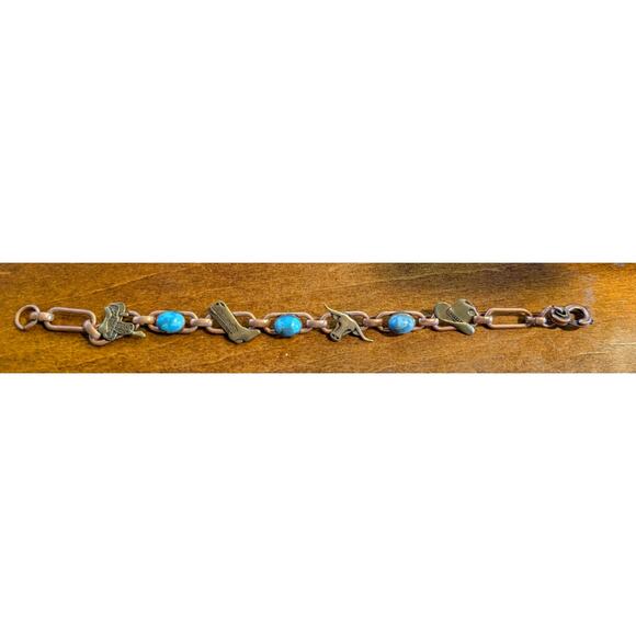 Bell Trading Post Turquoise Copper & Brass Cowboy Charms Link 7.25" Bracelet. Pre-owned, this bracelet is in excellent condition.