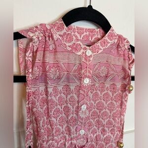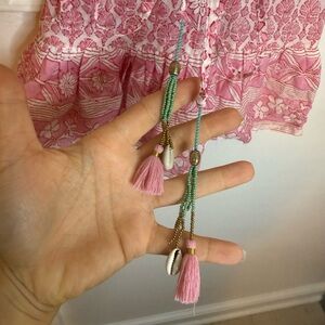 Pre owned excellent condition worn once or twice. Stunning pink and white bohemian cotton patterned ruffle sundress. So beautiful and perfect for summer. Has beaded and shell waist tie. One of the gold beads is missing from one tie (pictured). Girls size 2.