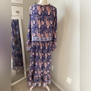 Bell by Alicia Bell paisley printed maxi dress in blue multi color. Good, pre- owned condition **flaws: one tassel is missing but both sides still have at least one in tact, also the dress was taken in approx. 0.5 inch on the sides but is very oversized and thus still seems to fit true to size, please see measurements(see last two photos for these references)**