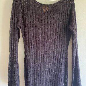 This full-length crochet dress is rendered in deep black, its weave thick yet semi-sheer, letting shadow and light play across the body.