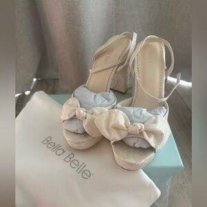 Colette ivory jacquard heels featuring 4-inch heels with a 1-inch platform gives you sky-high elegance with stability. Wrapped in luxe jacquard fabric, these platform ankle strap sandal have a playful knotted bow and regal pearl-encrusted clasp. The ankle straps ensure a secure fit all night long.