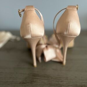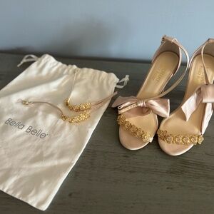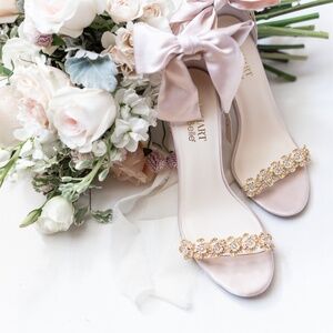 Belle Belle Mariee 4 inch light pink, silk, bow heels. Hand embellished crystal flowers and interchangeable ankle straps. Worn twice. Incredibly comfortable.