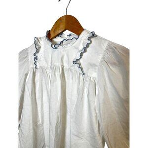 Classic and timeless Bella Bliss girls’ blouse in crisp white cotton. Features delicate ruffle trim with blue stitching, puff sleeves, and a button-back neckline for a polished, vintage-inspired look. Perfect for pairing with jumpers, skirts, or holiday outfits!