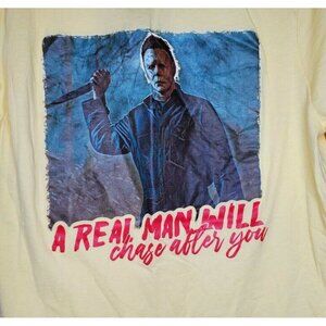 Bella + Canvas T-shirt featuring Michael Myers and Jason Voorhees with the text “A Real Man Will Chase After You” in bold design.