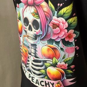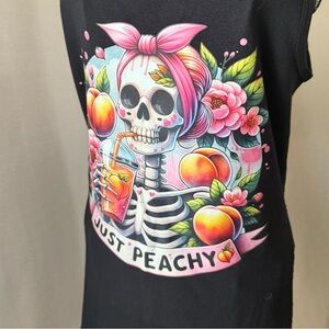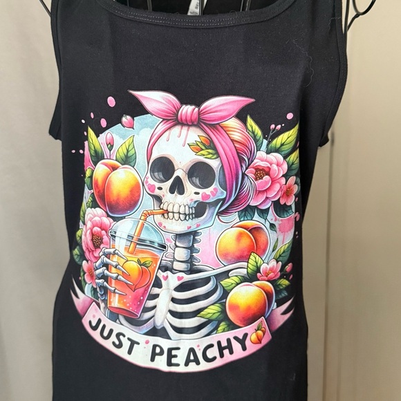 Stylish black tank top with vibrant skull and peach design. Features pink accents and floral details. Perfect for casual wear.
