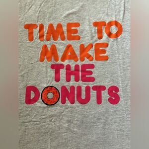 Bella + Canvas supersoft gray short sleeve T-shirt with Dunkin Donuts saying on front. NWOT L. The words "TIME TO MAKE THE DONUTS" with a donut screenprinted as the O in donuts. All printed in bright pink and orange letters in Dunkin Donuts font. A vintage blast from the past. Excellent condition never worn.