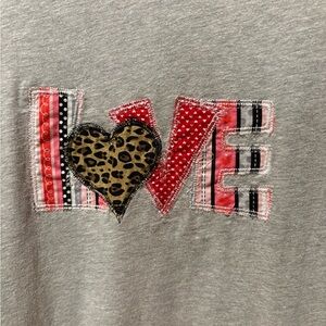Classic Bella Canvas tee in heather gray with “LOVE” in different patterns Soft and comfortable fabric T-Shirt. Women’s Large good condition. See measurements to insure this tee will be the correct fit for you. Thanks for looking!