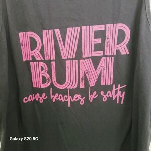 Stylish black tank top featuring a playful "River Bum" graphic in vibrant pink lettering, perfect for adding a touch of fun to your casual wardrobe. This sleeveless top has a classic tank silhouette with a comfortable fit, making it ideal for warm weather. The eye-catching graphic adds a unique and trendy element, while the versatile black color ensures it pairs effortlessly with various bottoms. Great for casual outings, beach trips, or summer festivals.