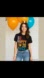 This is a pre-owned, black, short-sleeved t-shirt. The shirt is made of 100% cotton. The front of the shirt features a multi-colored graphic print that reads, "SO HAPPY I'M 20 TWICE". The shirt is a size XL. There are no visible stains or tears. The shirt is in good condition.