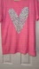 Pink V-Neck t-shirt featuring a Dalmatian print heart. Pit to pit is approximately 20”. Measurement from shoulder to bottom hem is approximately 29 1/2”. Tried on, didn’t fit me.