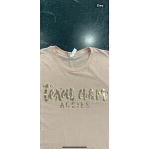 Bella + Canvas ladies T-shirt pink/rose gold Texas A&M LGin excellent pre-owned condition. Short sleeve light pink t-shirt with rose gold lettering that says Texas A&M AGGIES.