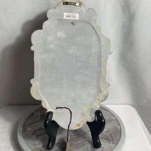 This vintage-style wall mirror from Bella Casa by Ganz features an ornate cream-painted frame with distressed detailing and elegant scrollwork. The mirror measures approximately 13” tall by 7” wide and includes its original Country Clutter hang tag and barcode label (BC4885). Made in China, it has a sturdy felted back with a sawtooth hanger for easy mounting. This piece is ideal for shabby chic, French country, or cottagecore décor styles.