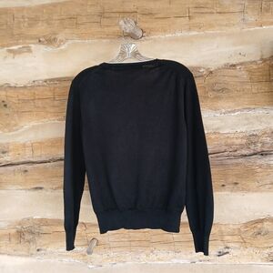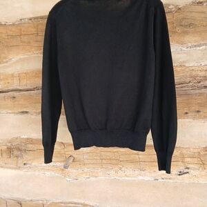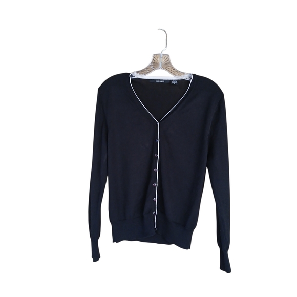 Bella Colori black V neck cardigan with white trim made of 70% silk and 30% cotton. It measures approximately 19" from pit to pit, 16" between shoulder seams, 22" sleeves, and 23" in length. Good used condition, size medium.