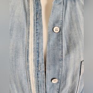 Love the details on this Bella Dahl chambray shirt- lightly faded from top to bottom with light striations of blue so it really look luxury and not flat- woven detail down button line and at cuffs- double pleate on the back for movement and volume- white enamel buttone- in very good condition- light use light wear-