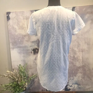 Tee-shirt styling with short sleeves and a v-neck featuring a raw edge high-low hemline in white, semi-sheer linen textured with white soft dots.