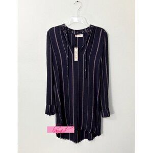 New with tags Bella Dahl "Striped Tunic Dress," size S. Sold out everywhere! Adjustable drawstring around the neckline with edgy corset-style lacing through metal grommets. Frayed hem. Slimming vertical stripes. V-neck. Long sleeves. Intentionally distressed knit is meant to mimic the look of linen, but without the scratchiness! Super buttery soft and comfy. Lightweight coziness. Anti-wrinkle fabric is perfect for travel!