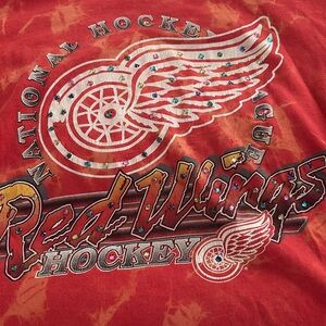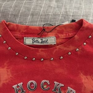 Vintage t shirt in dark orange/red 100% cotton. Multi colored rhinestones on picture and arm seams plus silver studs. No studs missing and in perfect condition. Like new. Paid $250!!