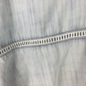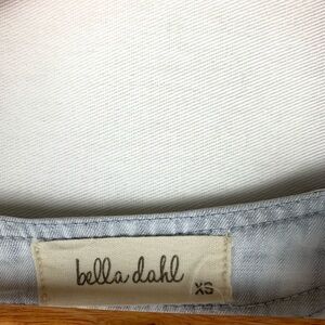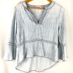 Bella Dahl light chambray peplum top that features a split deep neck, lightly flared sleeves, and a hi-lo hem.