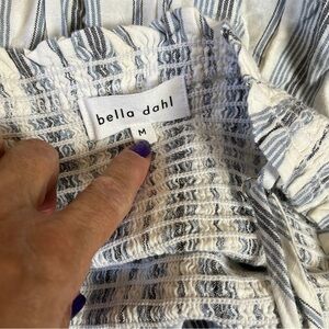 Striped jumpsuit with adjustable straps on a tube top type upper. Super soft and has pockets! Raw hem cream, blue and grey.