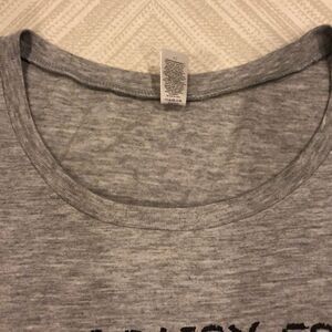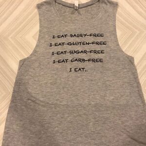 NWOT. Heather gray muscle tank top. Writing on tank top represents eating healthy. Made of polyester and viscose.