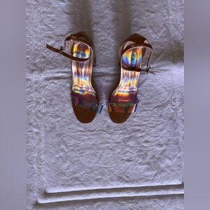 Bella luna bright golden High heels sandals size 8.5 This is a pre-owned pair of TOP MODA Gene 16 sandals for women in black. They have a mid-height block heel and a platform style. The upper material is fabric and the sandals are adorned with rhinestones. They are a size 8.5 in both AU and US shoe sizes.