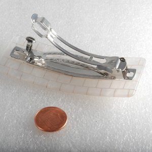 For sale is a Bella Luxe hair barrette. This barrette is made of a white pearlized plastic with a silver metal clip on the back.