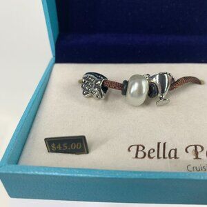 Celebrate cruising with this Bella Perlina set of three charms new in original clamshell presentation box. The set features three slider charms and two spacer charms presented on a metallic brown bronze tone cord. Charms are a silver cruise ship slider charm, a faux pearl slider charm and a silver tone cocktail slider charm. Add to your own charm bracelet. New in box.