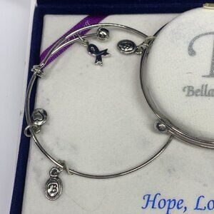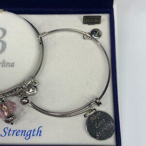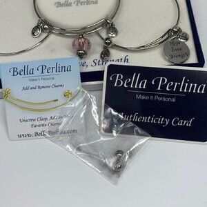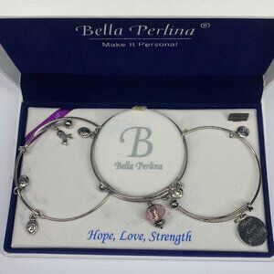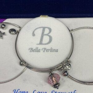Beautiful and inspirational Hope, Love, Strength bangle set for breast cancer, by Bella Perlina, style#:BP85014 new in presentation box with extra parts and authenticity card. Bangles are silver tone metal with tiny charms and expand to fit most wrists. New in original box. Perfect for gifting.