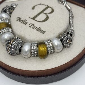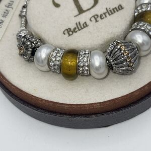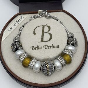 Elevate your accessory game with this stunning Bella Perlina beaded slide charm bracelet. Crafted with silver tone metal and adorned with silver, white, and gold beads, this bracelet is the perfect addition to any jewelry collection. Please zoom into pictures to see the beauty of the charms on this bracelet. Brand new and comes in very nice faux leather brown storage box. Comes from a smoke-free home.