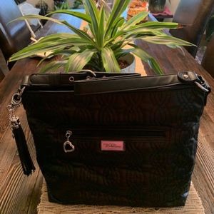 Zipper top and one front zipper pocket. Shoulder strap length is adjustable.
