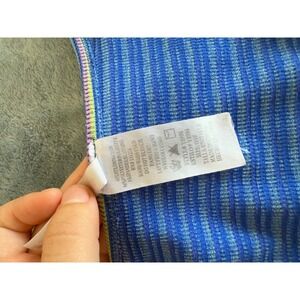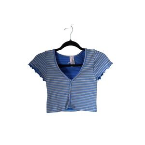Bella Seamless Striped Ribbed Cropped Top Blue Green Short Sleeve Button Front