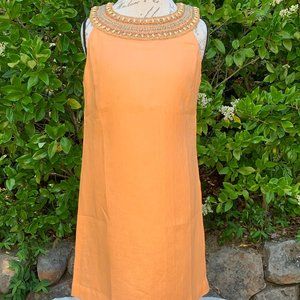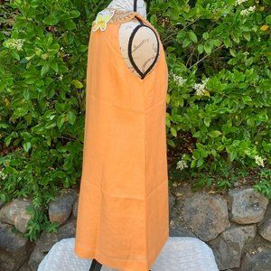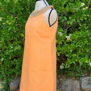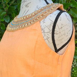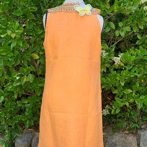 This Linen and lined dress in beautiful coral is sophisticated and bright. Glass beads, sequins and wood beads adorn this beauty making busy days a breeze. Just slip it over your head and the dress will take you from daily tasks to parties to dinner on the town.