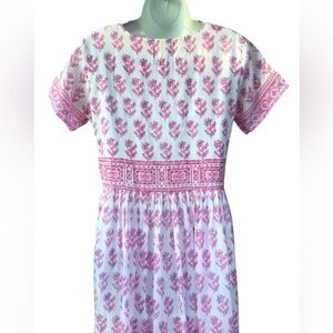 The Nikki 48” dress is a confection of hand block printed pink and purple pattern, accented with hand embroidery on the bodice. This tiered style slips overhead with a v-neckline and cap sleeve. This dress is fully lined and perfect for a for day or evening depending on your mood.