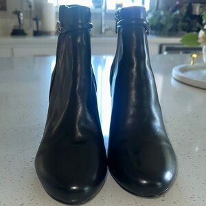 Experience timeless elegance with Bella Vita's black ankle boots, crafted from smooth leather and featuring a chic block heel. The minimalist design is enhanced by a subtle metallic accent, making these boots a versatile choice for any occasion. With a comfortable heel height and a slightly rounded toe, they offer both style and practicality.