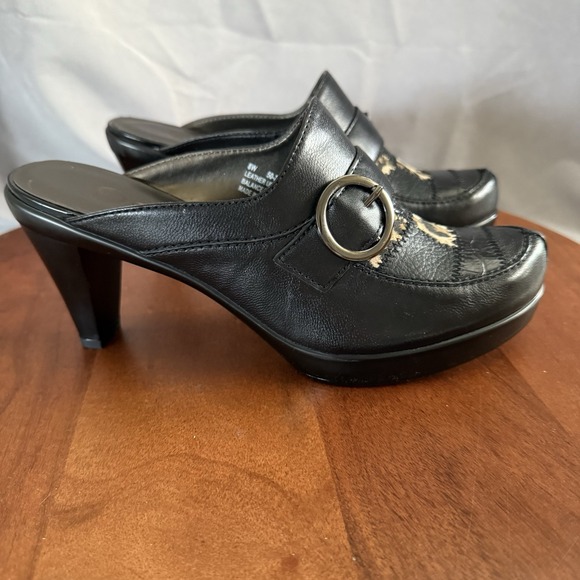 Bella Vita Black Leather Leopard Print Embossed Retro Mules Clogs Women Size 8W