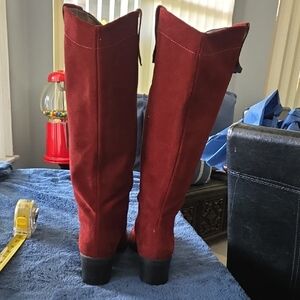 Elegant red heeled suede boots by Bella Vita. The color is a dark red suede, almost wine in color. They are made in Italy. Boots are gorgeous and new, with matched stitching. Perfect for any occasion.