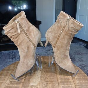Bella Vita Tan/Beige Suede Sz 6. 5 Bootie Tapered Heel Ankle Boots Gold Zipper