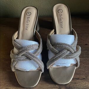 "Carmen" Bronze super suede with stones. Very comfortable. Signs of very minimal wear.