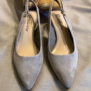 Display model. Show stoppers with style and elegance. Pointed toe, premium leather upper and adjustable ankle strap. Padded insole. 1” kitten heel. Size 9WW Color Almond *Each shoe has a couple of worn spots. Shown up close in pictures but unless you’re closely looking the spots are not noticeable. Shoes have a lot of wear left to them.