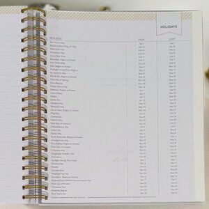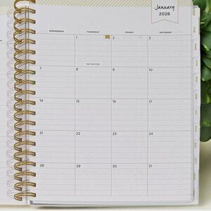The metallic gold twin wire spiral binding combines durability with style, while the contemporary white pages with gold accents enhance its overall elegant appeal.