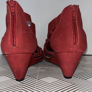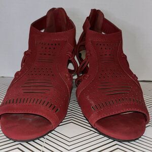 Elevate your outfit with these stunning Bella Vita Boliver sandals in size 7W. The red synthetic material and laser cutout design give off a bohemian vibe, perfect for weddings, parties, and formal events. The sandals feature a mid-height wedge heel and gladiator style with a zip closure for easy wear. The perforated accents add a touch of elegance to the overall look. These sandals are perfect for the fashion-forward woman looking to make a statement.