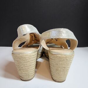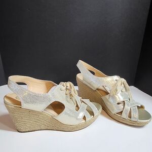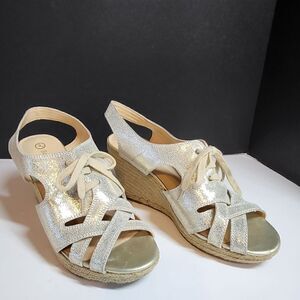 Bella Vita gold wedge sandals. Size 12 med. Leather uppers. Open toe & tie ups. 4" heels.