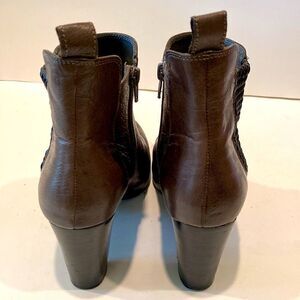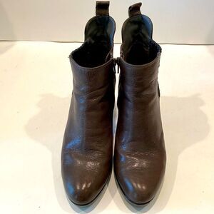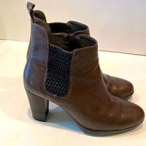 Excellent condition: Gorgeous Brown Leather uppers with black goring; 3” heels; bottom of heel to top of boot measures approx. 7”; side-zip