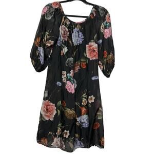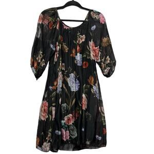 Bellambia Made In Italy Floral Dress / Size- Medium / Color- Black With Multi Colors / Pre-Owned / 70% Viscose, 30% Silk, Lining- 95% Viscose, 5% Elastane / Puff Sleeves