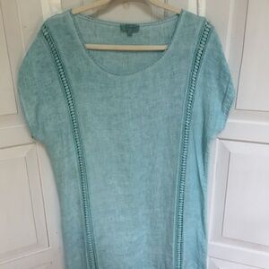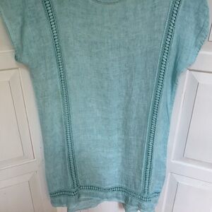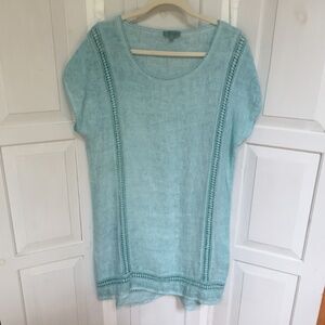 Stay stylish and comfortable with this light blue (does appear light green in some lighting) Bellambra linen swim coverup with open eyelet detail. Perfect for a day at the beach or poolside lounging or wear it as a dress!