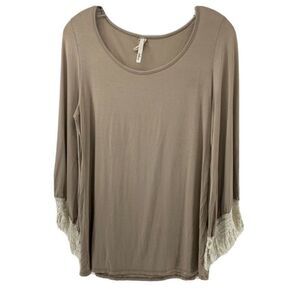 Bellamie Womens Fringe Bell Sleeve Boat Neck Relaxed Fit Blouse Womens Size Medium Light Brown Taupe With White Contrasting Cuffs Neutral Tones Casual Top