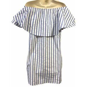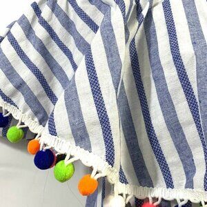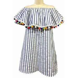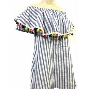 Bellamie Women's Size Small Off The Shoulder Tunic Dress Blue White Striped Pom Pom Linen Blend Side Pockets Fun Flirty Summer